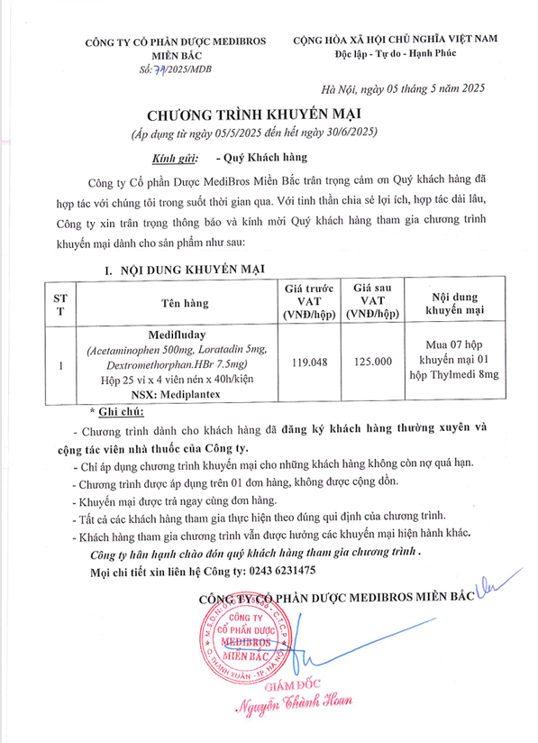 CTKM Medifluday số 74/2025/MDB áp dụng từ 05/05/2025 đến 30/06/2025