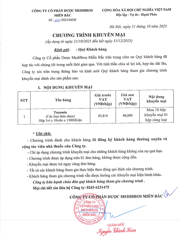 CTKM số 126/2025/MDB Chương trình khuyến mãi Tuzamin áp dụng từ 21/10/2025 đến 31/12/2025
